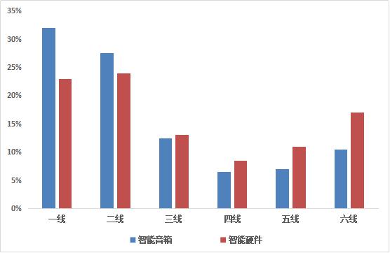 從上述圖表中可以看出,智能音箱用戶相較于智能硬件用戶在一二線城市占比更大。