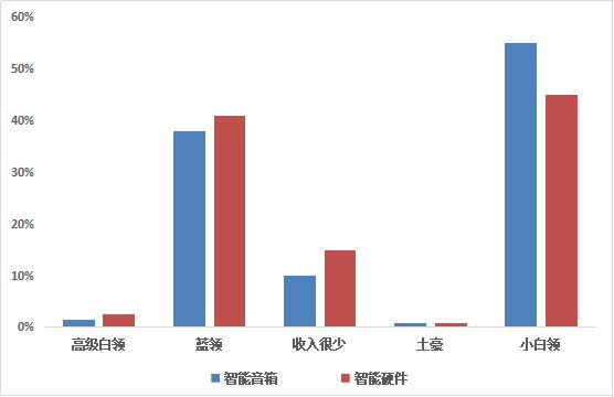 從上述圖表中可以看出,智能音箱用戶以小白領(lǐng)、藍(lán)領(lǐng)等一定消費(fèi)能力的人群為主,智能音箱小白領(lǐng)用戶占比更高。