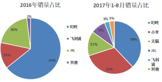 2016年整體智能音箱呈京東叮咚壟斷的趨勢,占比高達(dá)65%,飛利浦與JBL占比分別為14%、20%。2017年隨著更多廠商加入到智能音箱的市場,整體市場格局發(fā)生了改變,叮咚的市場份額降到38%,小米緊追其后,占比32%。