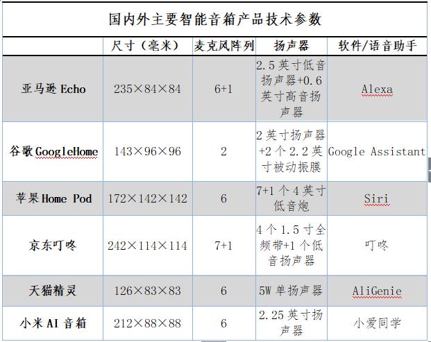 國內(nèi)外主要智能音箱產(chǎn)品技術(shù)參數(shù)