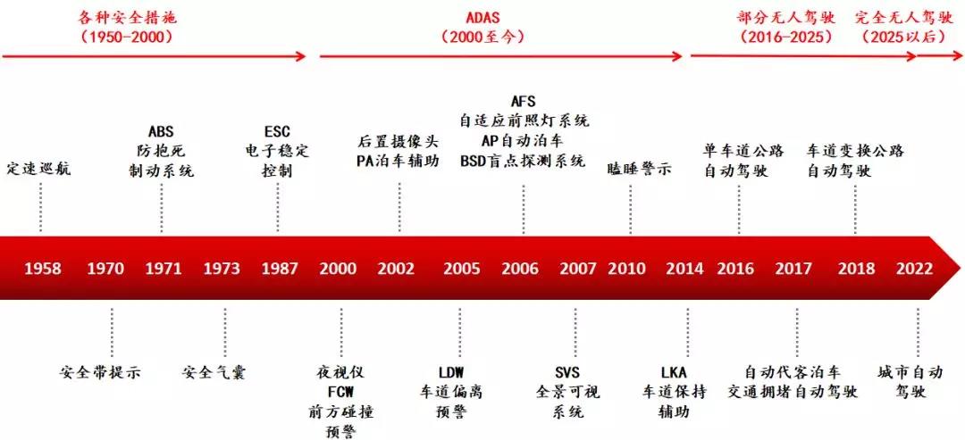 無人駕駛技術最初的發(fā)展從減少、防止機動車事故開始。從1950年至2000年,OEM車廠和Tier 1的零部件制造商對車輛發(fā)明、生產(chǎn)了許多結(jié)構(gòu)性的改進。最核心的就是四大安全系統(tǒng):安全帶,防抱死制動系統(tǒng)(ABS),安全氣囊和電子穩(wěn)定控制(ESC)。