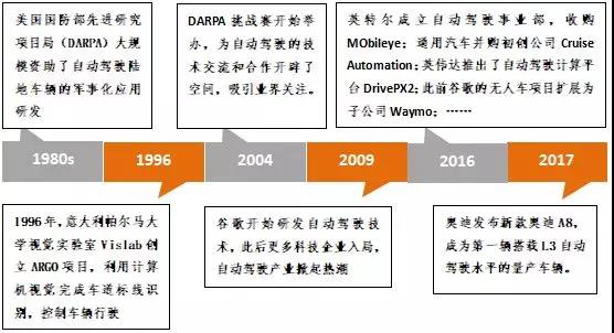 無人駕駛的概念早已有之。早在1925年,無線電設備公司Houdina Radio Control公司設計實現(xiàn)第一輛無人駕駛汽車American Wonder;1956年,通用公司公布世界上第一輛配備了汽車安全及自動導航系統(tǒng)的概念車Firebird II;20世紀 60、70年代,西方發(fā)達國家開展無人駕駛車輛研究應用于軍亊領域;20世紀90年代開始,技術的突破帶動無人駕駛汽車的快速發(fā)展,激發(fā)了各國研究的熱情;2004年,美國國防部高級研究項目局(DARPA)舉辦了無人駕駛進程中最重要的挑戰(zhàn)賽,三屆比賽對后來的技術發(fā)展產(chǎn)生了深進的影響;2009年開始,Google為代表的各大公司陸續(xù)開始無人駕駛技術的研究,拉開了產(chǎn)業(yè)序幕。隨著技術產(chǎn)業(yè)鏈的日臻成熟,2016年被公認是無人駕駛元年,目前業(yè)界也正在積極推動以市場為主導、企業(yè)為主體的產(chǎn)業(yè)化落地。