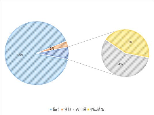晶硅太陽能電池約占市場(chǎng)份額90%;薄膜太陽能電池占市場(chǎng)份額約10%,其中碲化鎘市場(chǎng)份額約4%,銅銦鎵硒約占市場(chǎng)份額3%。其他薄膜電池如軍工領(lǐng)域應(yīng)用較多的砷化鎵、目前無法規(guī)模化的鈣鈦礦等太陽能電池占市場(chǎng)份額約3%。碲化鎘目前90%的市場(chǎng)由美國薄膜電池制造商First Solar壟斷。