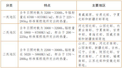 太陽能資源的分布與各地的緯度、海拔高度、自然地理狀況和氣候條件有關(guān)。我國屬太陽能資源豐富的國家之一,全國總面積2/3以上地區(qū)年日照時(shí)數(shù)大于2000h,根據(jù)中國氣象局風(fēng)能太陽能評(píng)估中心推薦的國內(nèi)太陽能資源地區(qū)分類辦法,共分5類,其中:
