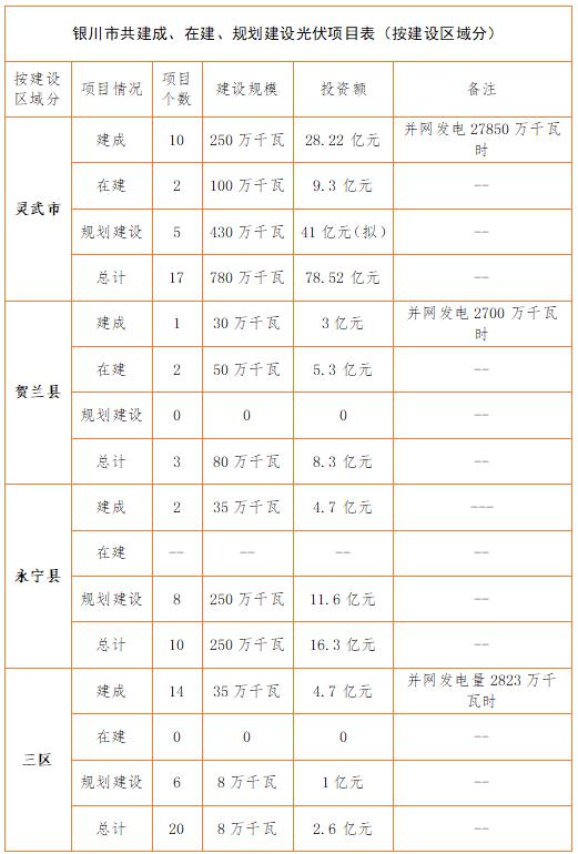 銀川市發(fā)改委項(xiàng)目資料顯示情況:截止2017年上半年,銀川市共建成、在建、規(guī)劃建設(shè)光伏項(xiàng)目50個(gè),建設(shè)規(guī)模1118萬千瓦,投資約108.82億元。