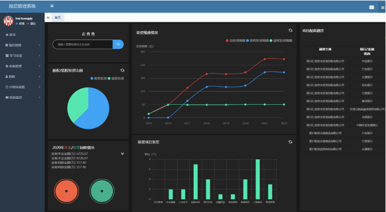 為進一步全面推進集團公司國企改革三年行動工作落實落地,積極探索公司數(shù)字化轉型新路徑,推動數(shù)字經(jīng)濟與風險防控深度融合,著力提升公司合規(guī)風控及投后管理的標準化、規(guī)范化、信息化水平,銀川智慧信息科技有限公司根據(jù)集團公司關于國企改革、數(shù)字化轉型和高質量發(fā)展的整體工作部署,打造了投后管理系統(tǒng)平臺,目前,已正式投入使用。平臺旨在通過投后管理系統(tǒng)平臺進行良好的投后管理,為化解風險提供精準有效的數(shù)據(jù)支撐,減少或消除潛在投資風險,保障國有投資安全,實現(xiàn)國有資產(chǎn)的保值增值。